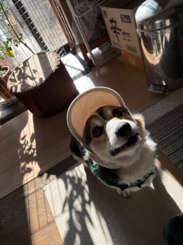 最近、近所の先輩コーギーさんと散歩してます。その先輩から帽子もらったら