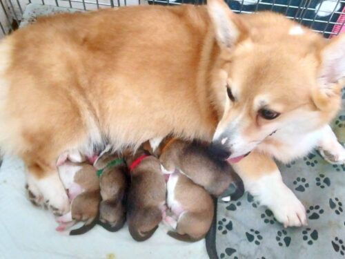 4月26日に男の子2頭、女の子3頭(全犬レッド&ホワイト)を出産しました。